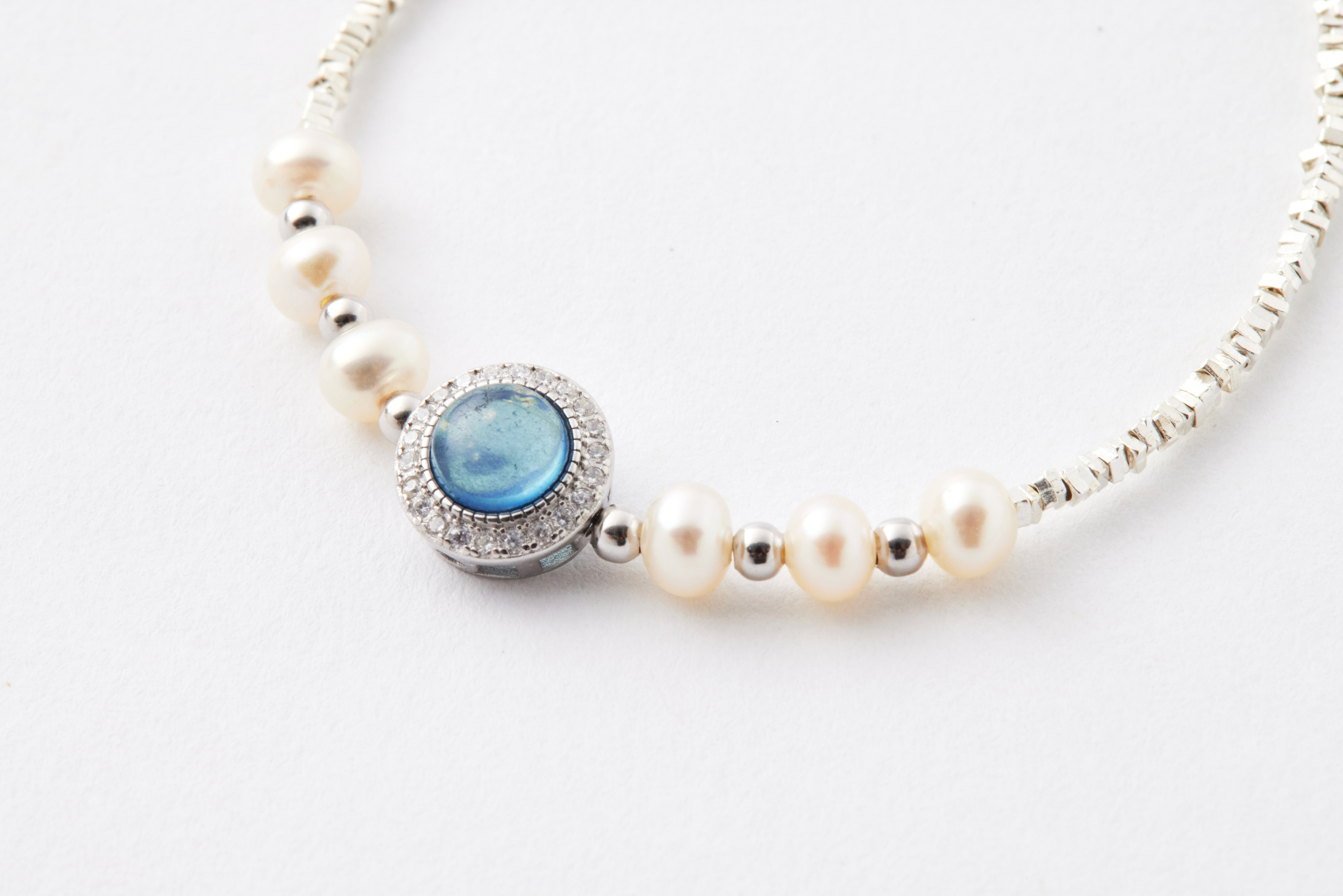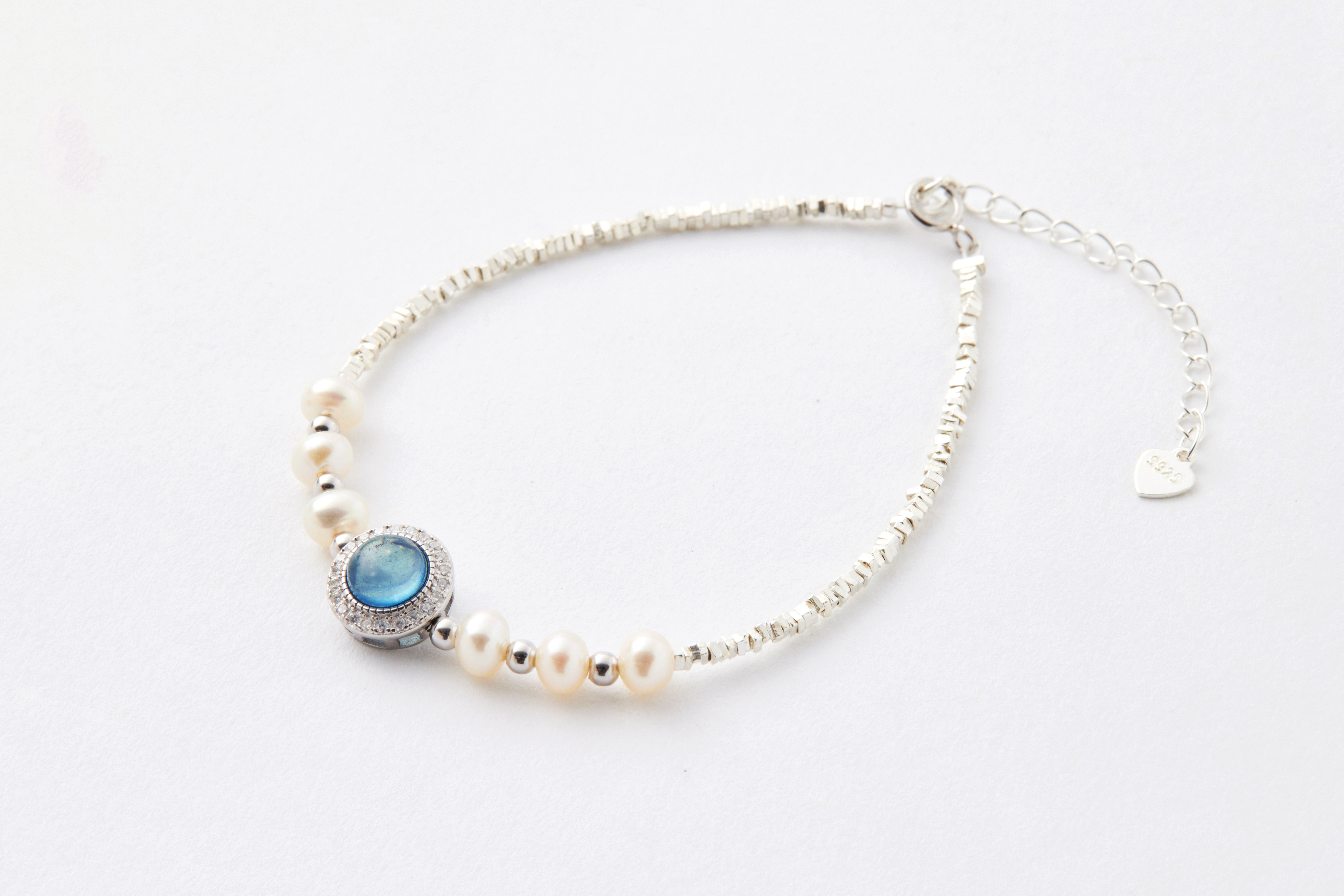 ● 尺寸:海藍寶約 0.7 cm、珍珠約 0.4 cm、銀珠約 0.2 cm