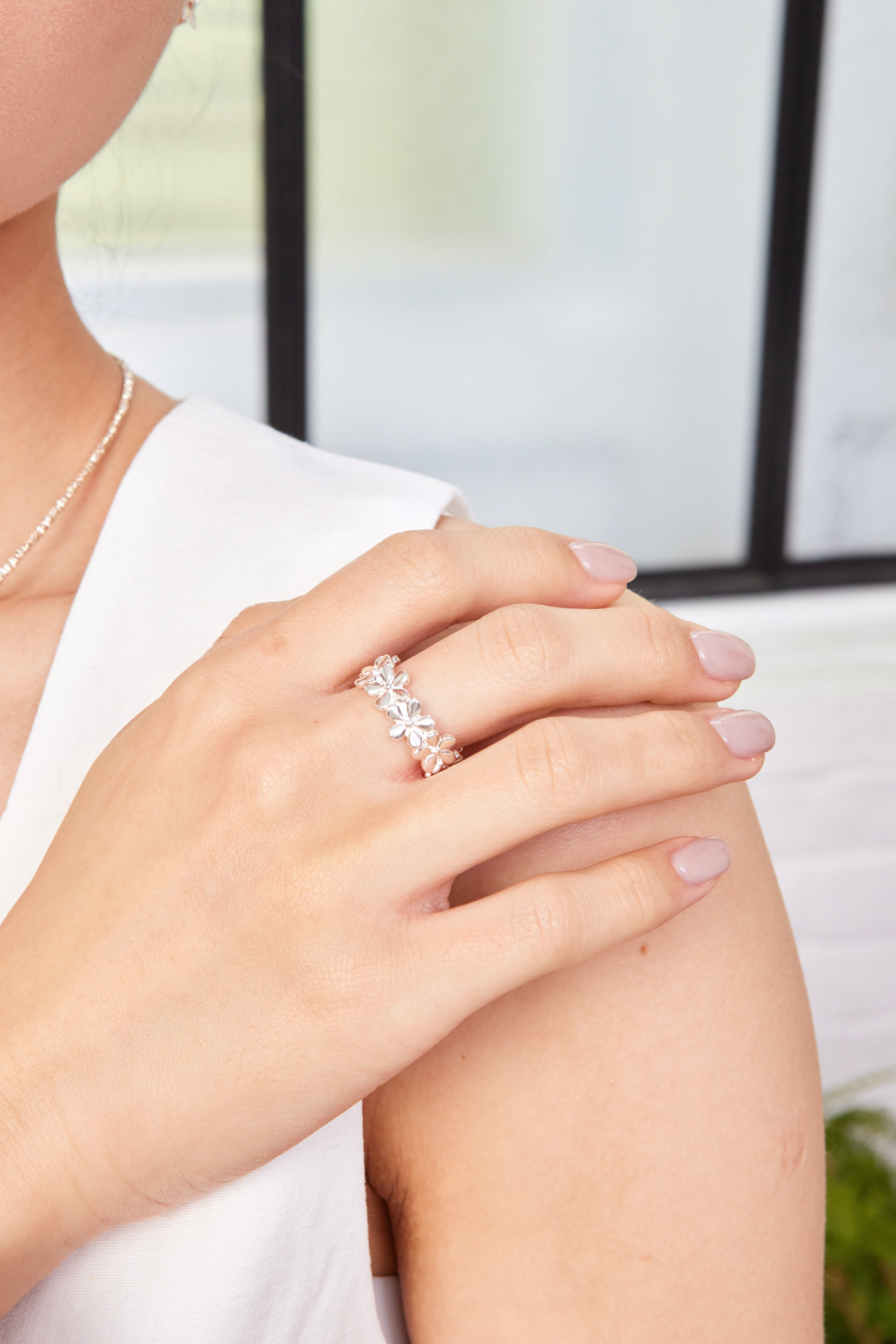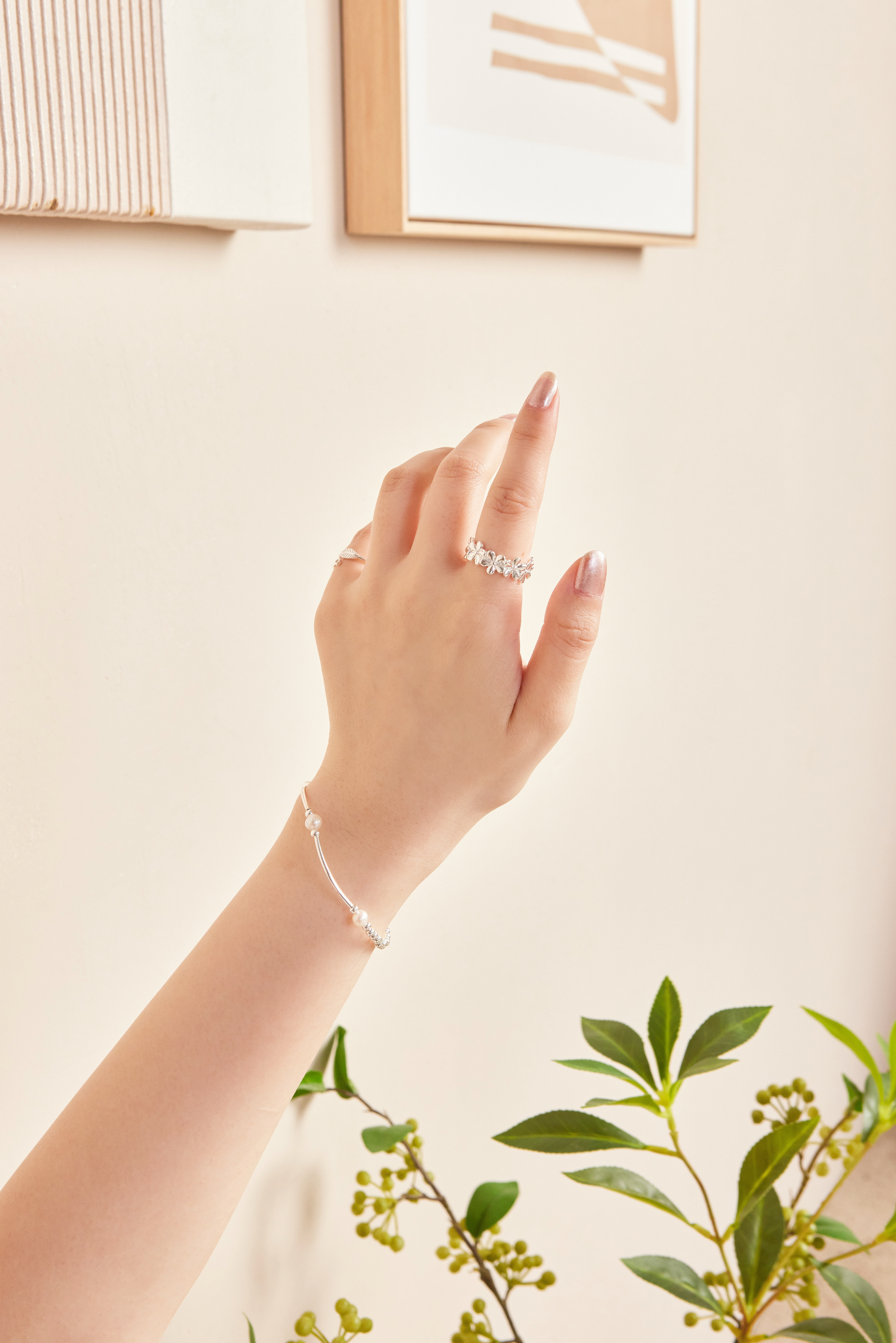 - 小巧花朵造型增添手部細節的浪漫氛圍
